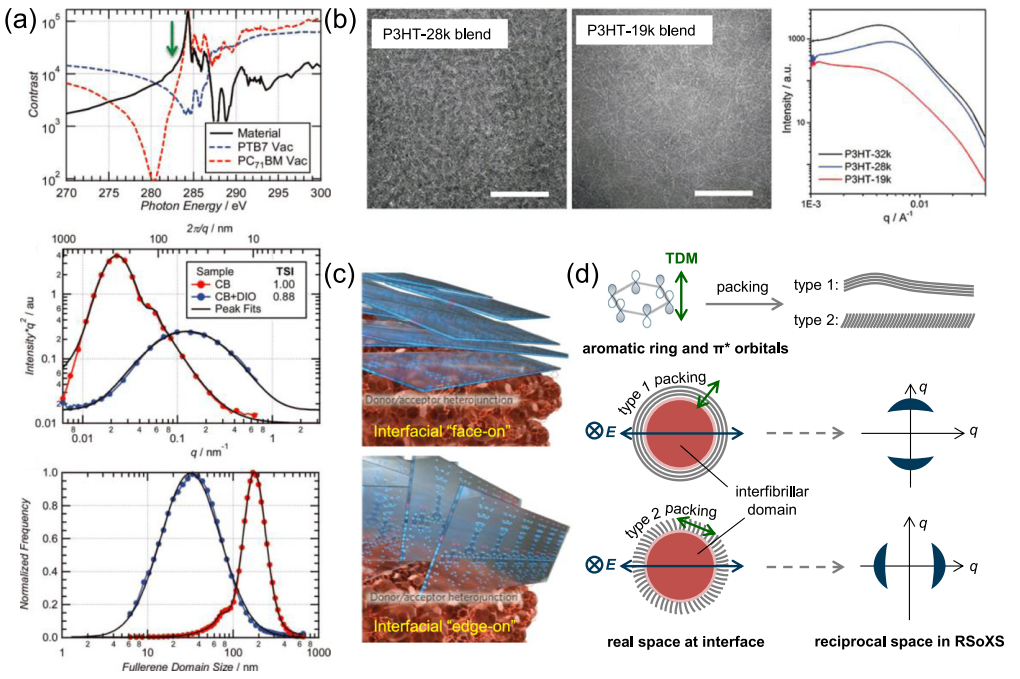 传统表征技术在解析活性层复杂形貌时存在明显局限性。扫描电子显微镜(SEM)与透射电子显微镜(TEM)虽能提供高分辨率实空间图像,但需对样品进行染色、切片等破坏性预处理,且难以区分化学组成相近的给体/受体相;硬X射线小角散射(SAXS)依赖电子密度差异获取结构信息,而有机光伏材料中给体与受体的电子密度通常较为接近,导致相分离细节难以精准捕捉;原子力显微镜(AFM)仅能表征样品表面形貌,无法反映活性层内部及埋层界面的结构特征。RSoXS技术凭借其化学敏感性、宽尺度表征能力与偏振调控特性,为有机太阳能电池活性层形貌的精准解析提供了突破性解决方案,成为推动OPV 技术发展的核心表征工具。