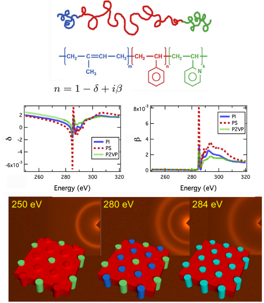 RSoXS技术凭借化学敏感性与宽尺度表征能力,为嵌段共聚物的精细结构解析提供了突破性解决方案。其核心优势在于通过将入射X射线能量精准调控至嵌段特征元素的吸收边,可利用不同嵌段在近边精细结构(NEXAFS)上的光谱差异,显著增强相区散射对比度,实现无需化学标记的“选择性成像”。例如,在聚异戊二烯-聚苯乙烯-聚2-乙烯基吡啶(PI-b-PS-b-P2VP)三嵌段共聚物体系中,硬X射线SAXS仅能观测到单一的六方密堆积圆柱结构,却无法区分PI、PS与P2VP 三相,而RSoXS通过能量调控可实现相区“选择性凸显”。当光子能量调至250 eV 时,PI与PS的色散分量匹配,散射信号仅来源于P2VP嵌段,清晰呈现其圆柱分布;调至284 eV时,PI与P2VP 的吸收分量匹配,仅PS嵌段的六方圆柱结构被检出;调至280 eV时,三相对比度均未抵消,可同时观测到PI/PS与PS/P2VP两组嵌套的六方圆柱结构,直接证实了三嵌段共聚物“双嵌套有序相”的存在,提供了更丰富的定量结构信息(如不同嵌段的晶格间距)。此外,RSoXS结合偏振调控(P-SoXS)还能进一步解析嵌段共聚物的分子取向与界面结构。以聚苯乙烯-聚2 -乙烯基吡啶(PS-b-P2VP)嵌段共聚物薄膜为例,利用线偏振软X射线,可通过散射各向异性识别PS与P2VP相界面处的分子键取向。当X射线能量调至碳K边时,PS的C-C键与P2VP的C-N键因化学环境差异,对偏振电场的响应不同,散射信号的方位角分布可直接反映键取向的择优程度。研究发现,铸态PS-b-P2VP薄膜中,层状相分子沿膜面呈“face-on”取向,且贯穿整个膜厚;经105℃退火2小时后,膜表面30 nm深度内分子取向显著无序,而膜-基底界面处仍保持高度有序,这一深度依赖的取向差异,为理解退火对嵌段共聚物薄膜性能的调控机制提供了微观依据。综上所述,RSoXS技术不仅解决了嵌段共聚物复杂相结构的“化学区分”难题,更能实现从纳米到微米尺度的多维度表征(相区分布、分子取向、深度依赖结构),为嵌段共聚物的自组装机制解析、结构调控及功能化应用提供了关键技术支撑,推动其在高精度纳米制造、能源存储等领域的应用突破。