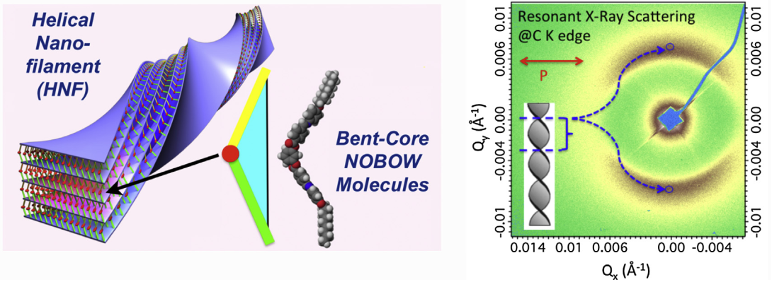 RSoXS技术凭借化学敏感性与偏振调控能力,为液晶螺旋结构的定量表征提供了突破性解决方案。一方面,通过将入射X射线能量调控至液晶分子特征元素(如碳K边284 eV、氧K边543 eV)的吸收边,可利用手性分子与非手性分子在近边精细结构(NEXAFS)上的光谱差异,增强螺旋结构与周围基质的散射对比度,精准定位螺旋区域;另一方面,结合线偏振软X射线,RSoXS可通过散射各向异性与分子跃迁偶极矩的相互作用,解析螺旋结构的取向信息(如螺旋轴方向),并基于散射峰的q值(散射矢量)定量计算螺旋螺距。