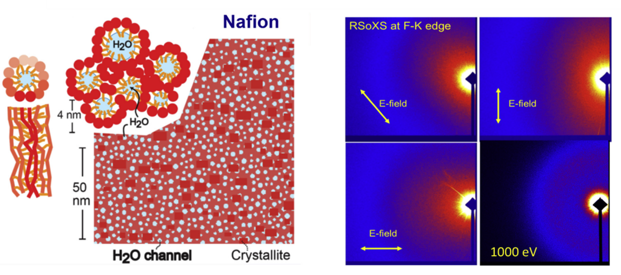 然而,传统硬X射线小角散射(SAXS)技术在解析此类膜的异质畴结构时存在显著局限性。由于密度相近但分子取向不同的微区在硬X射线作用下电子密度差异极小,散射对比度极低,无法有效区分离子导电畴与周围基质的微观分布,更难以捕捉畴取向的细微特征,极大制约了对“界面取向-传输性能”关联的深入理解。RSoXS技术凭借能量可调的化学敏感性,为突破这一表征瓶颈提供了核心解决方案。通过将入射X射线能量精准调控至材料中特征元素的吸收边(如氟K边 696 eV),可利用不同相区在近边精细结构(NEXAFS)上的光谱差异,显著增强目标相(如含氟离子导电畴)与基质的散射对比度,实现对低对比度异质畴的精准识别与表征。