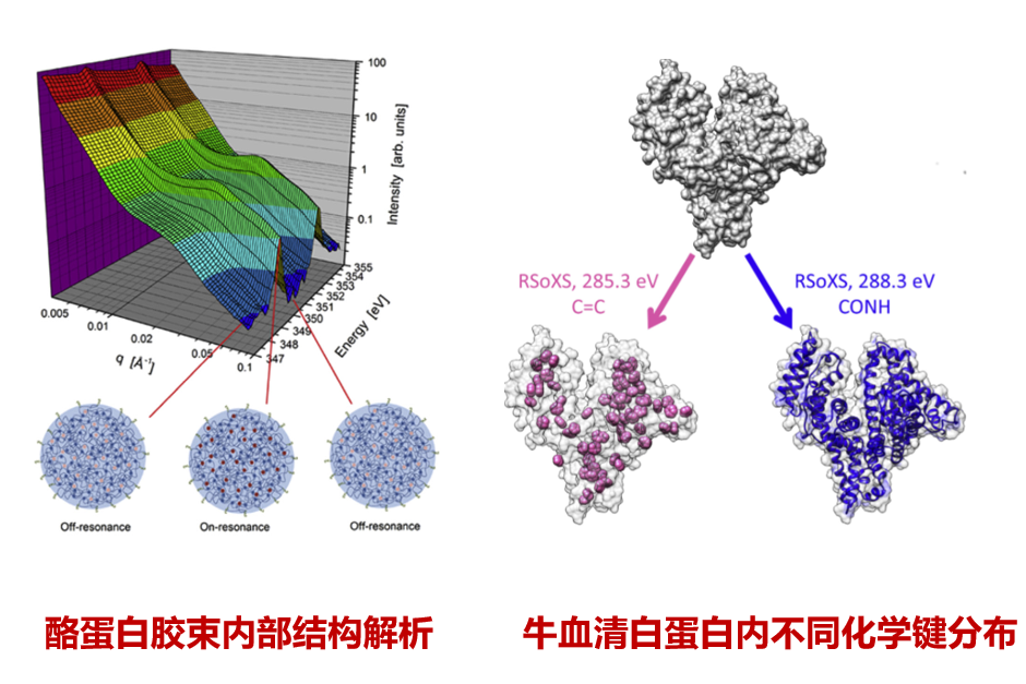 生物材料作为一类兼具自组装特性与显著结构层次性的特殊材料体系,其微观结构与宏观功能的关联是材料科学与生命科学交叉领域的核心研究方向。然而,传统表征技术(如硬X射线散射、电子显微镜)或因化学对比度不足难以区分成分相近的生物分子结构,或因需破坏性预处理(如染色、干燥)无法还原材料在生理环境下的真实状态,制约了对生物材料结构-功能关系的深入解析。RSoXS凭借其高的化学敏感性,为探索天然生物材料与仿生合成材料的结构机制提供了关键技术支撑。一方面,通过将入射X射线能量精准调控至生物分子特征元素(如碳K边284 eV、氮K边410 eV、氧K边543 eV)的吸收边,可利用不同生物组分(如蛋白质、多糖、脂质)在近边精细结构(NEXAFS)上的光谱差异,实现对成分相近但化学环境不同的微区的特异性识别;另一方面,结合溶液环境样品池(如硅氮化物窗口封装的液体池),RSoXS可在接近生物材料生理状态的条件下,原位表征其动态自组装过程(如胶原纤维的逐级聚合、囊泡的融合)与多层级结构(如从分子聚集体到微米级组织的多尺度有序性),无需依赖化学标记或样品干燥处理。