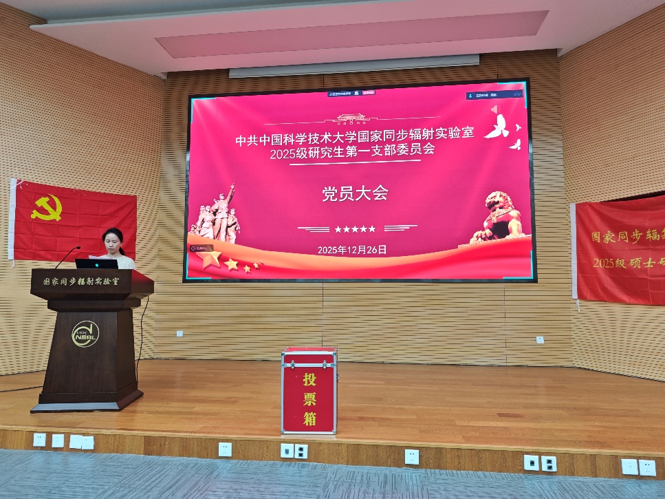 2025年12月26日晚,中国科学技术大学国家同步辐射实验室2025级研究生第一党支部在国家同步辐射实验室二号楼一楼学术报告厅召开党员大会。会议由党员大会筹备工作领导小组成员黄瑞萱同志主持。国家同步辐射实验室党委(核科学技术学院党委)副书记周婷、党委委员李和廷、党务秘书潘志云以及筹备组成员胡传圣列席会议并进行指导,支部全体党员参加会议。