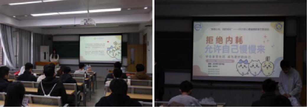 活动伊始,主持人结合研究生学术日常抛出“是否容易内耗”的议题,引发全场共鸣。实验进度迟缓、文献理解困难、易被外界竞争裹挟等困扰,精准戳中了研究生群体痛点。随后的分享环节中,同学们互相讨论科研、生活中的困惑,也相互宽慰、鼓励彼此。世事无常与偶尔的孤独挫败,都是成长的必经之路,唯有接纳自身不完美,以坦然心态面对得失,学会适度放松,才能在学术道路上走得更稳更远。现场展示的“山不让尘,川不辞盈”“好事多磨,伟大的事情需要时间”等励志箴言,进一步激励着同学们调整心态,专注走好自己的科研与人生之路。