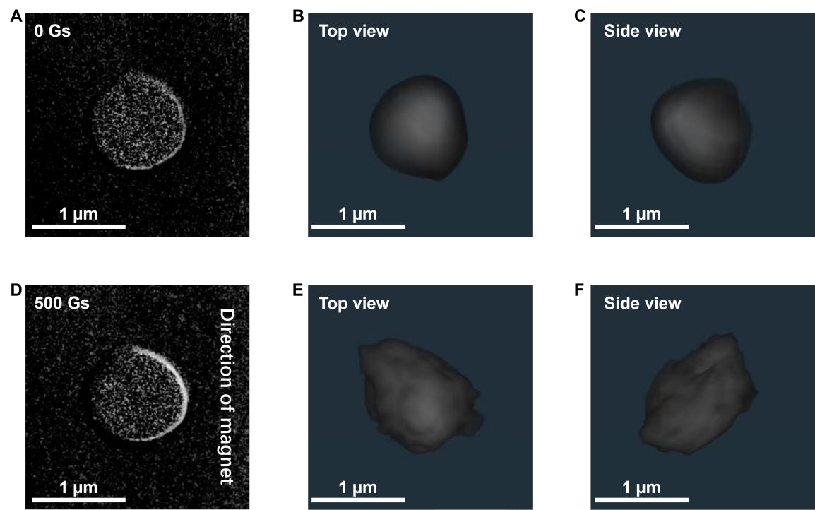 图1 A- C. 0G 下 Fe-LMS 的二维和三维 CT 重建图像。D-F. 500Gs下 Fe-LMS 的二维和三维CT重建图像。直观证明磁场对铁原子聚集的影响:在0 Gs磁场条件下,X-ray 3D CT显示铁原子均匀对称地分布在球体中(图1A)在500 Gs磁场条件下,X-ray 3D CT显示铁原子明显向一侧聚集(图1D)。