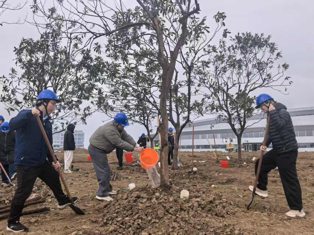 植树现场热火朝天,党员们配合默契、干劲十足,挥锹挖坑、扶苗填土、踩实浇水,每一个步骤都一丝不苟,忙碌的身影构成了一道亮丽的风景线。经过一番辛勤劳作,一株株新苗整齐排列、迎风挺立,为初春的园区增添了盎然生机,党员们在新苗旁合影留念,定格下这一携手共建、绿色同行的美好时刻。