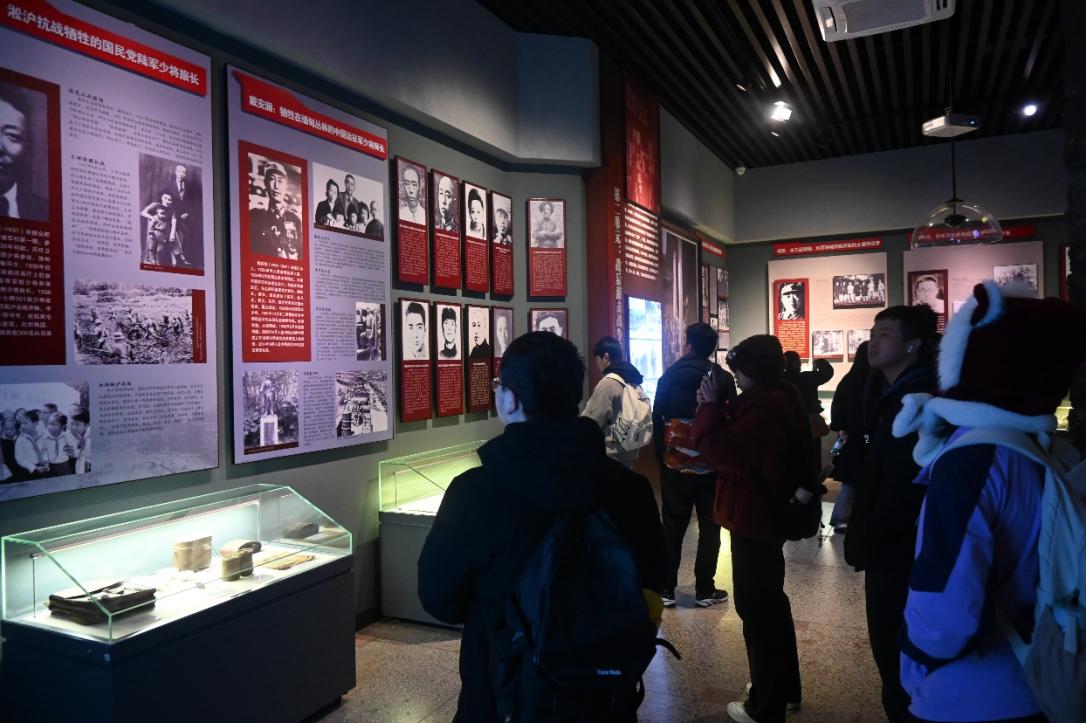 展墙之上,图文交织铺展——从淞沪战场牺牲的国民党爱国将士事迹,到印刻着硝烟痕迹的历史照片、肃穆的烈士名录,生动还原了 1932 年蒋光鼐、蔡廷锴率领十九路军浴血抗倭的悲壮战役;玻璃展柜里,抗战时期的实体文物静静陈列,将岁月的厚重凝于方寸之间。庄重的氛围里,历史的温度与力量扑面而来,同学们站在这里,仿佛能听见当年的枪炮声,更明白我们的和平来之不易,我们年轻一代更该承担起这份“守护”的责任。
