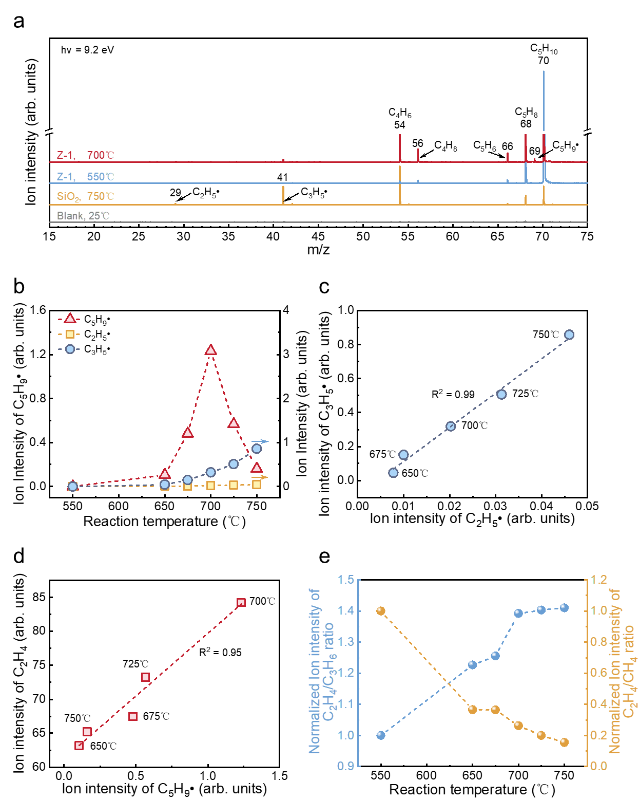 1. 在线真空紫外光电离质谱(SVUV-PIMS)表征。a)光子能量为9.2 eV时采集的谱图:750 ℃下二氧化硅(SiO2)、550 ℃700 ℃下催化剂上1-戊烯裂解反应的PIMS谱图。反应条件:氩气(Ar)中含70% 1-C5H10气体,压力2 Torr,流速100 sccmb)分子筛上1-戊烯裂解反应中,SVUV-PIMS谱图中气态乙基自由基(C2H5)、烯丙基自由基(C3H5)和戊烯基自由基(C5H9)的强度随反应温度的变化。c)分子筛中C2H5离子强度与C3H5离子强度的推导相关性。d)乙烯(C2H4)离子强度、e)归一化的C2H4/丙烯(C3H6)比及C2H4/甲烷(CH4)比与分子筛中C5H9自由基离子强度的相关性。