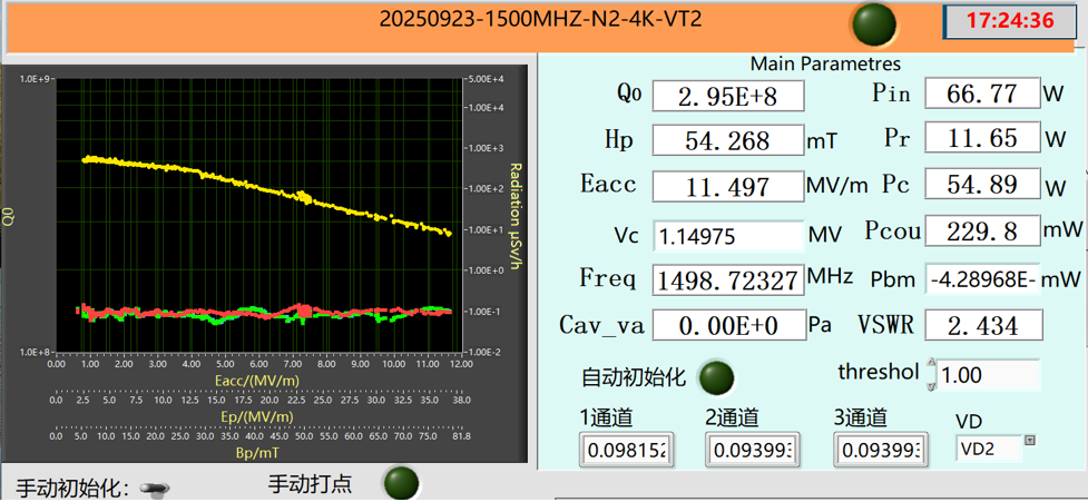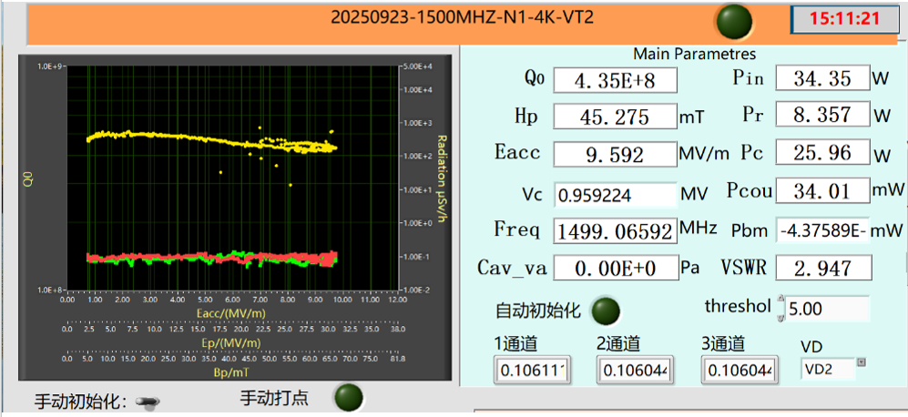 2025年9月23日,高次谐波腔的垂直测试在中国科学院高能物理研究所怀柔区先进光源技术研发与测试平台完成。在4.2 K温度下,达到以下指标: